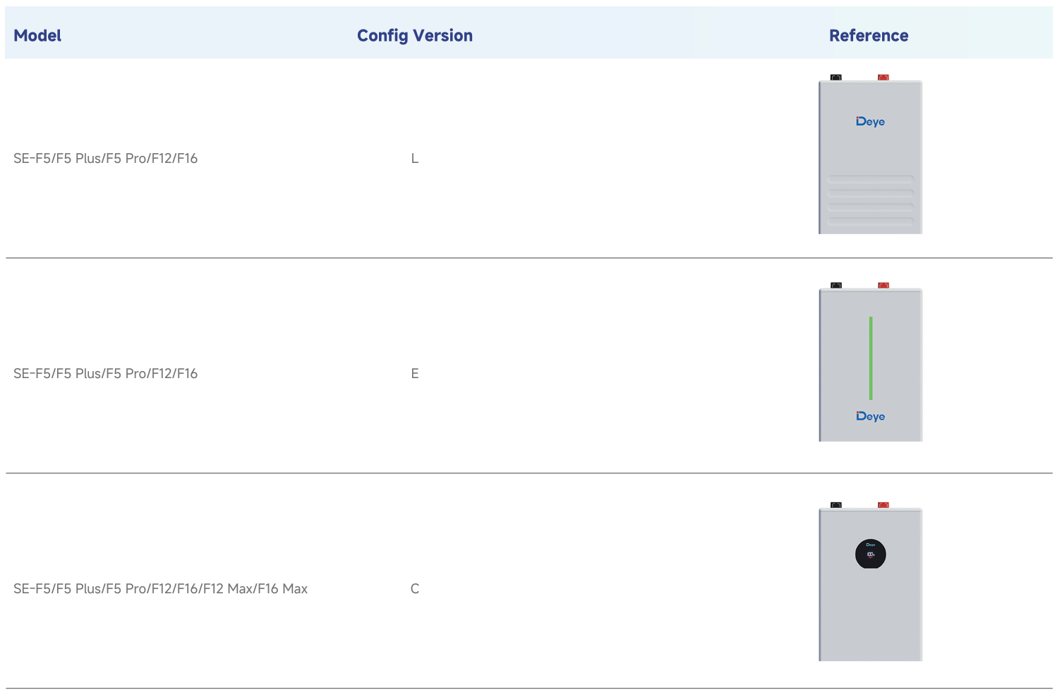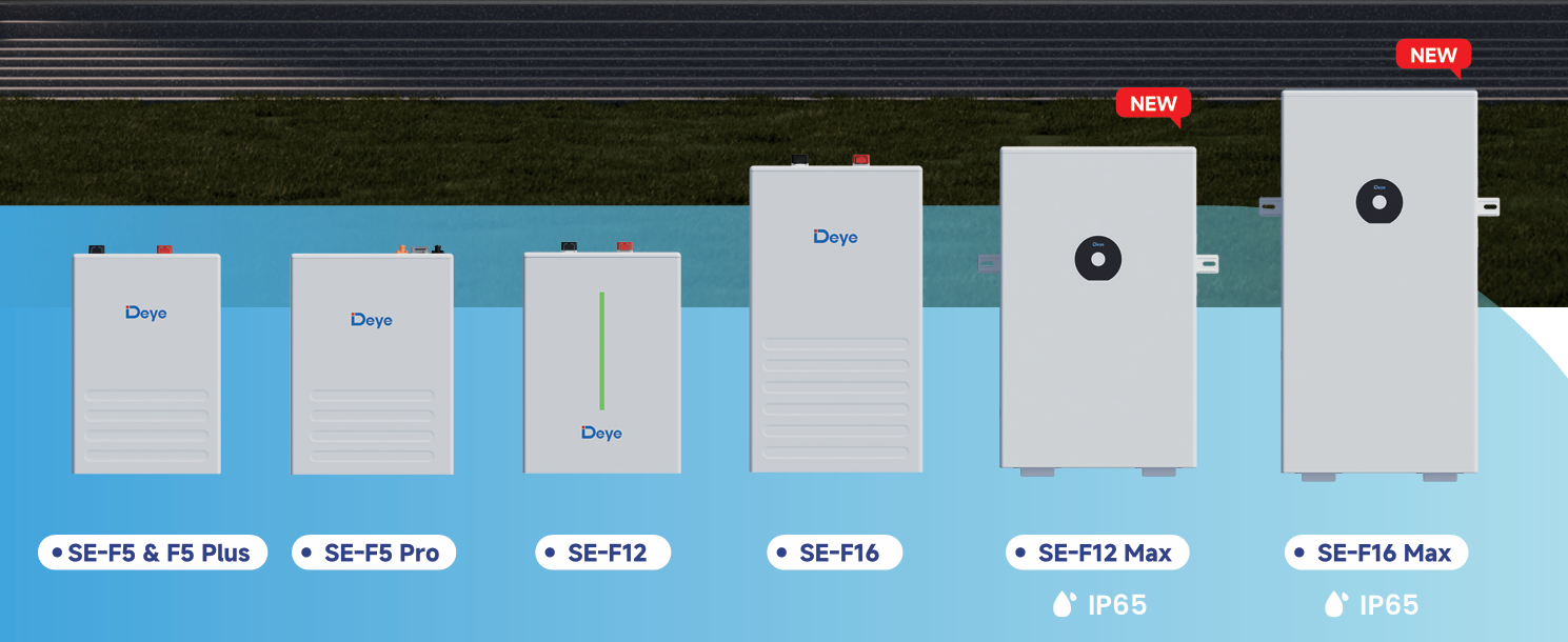 Tá SE-G5.1 Pro-B Deye fós in úsáid go forleathan san Eoraip mar cheallraí raca 5.12 kWh. Coinníonn an SE-F5 Pro níos nuaí an ailtireacht chéanna 51.2 V / 100 Ah, ach aistríonn sé an táirge i dtreo suiteáil balla / urláir / cruachta agus cuireann sé modúl monatóireachta wifi / Bluetooth roghnach laistigh den éiceachóras SE-F.
