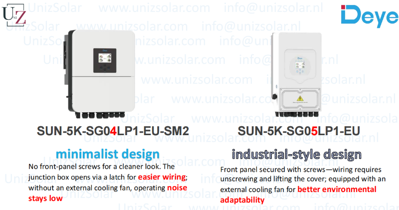 ● SUN-5K-SG05LP1-EU : Tá sé níos oiriúnaí do mhodúil gréine ísealchumhachta (≤500 W) agus soláthraíonn sé inoiriúnaitheacht chomhshaoil níos fearr trína lucht leanúna fuaraithe seachtrach.