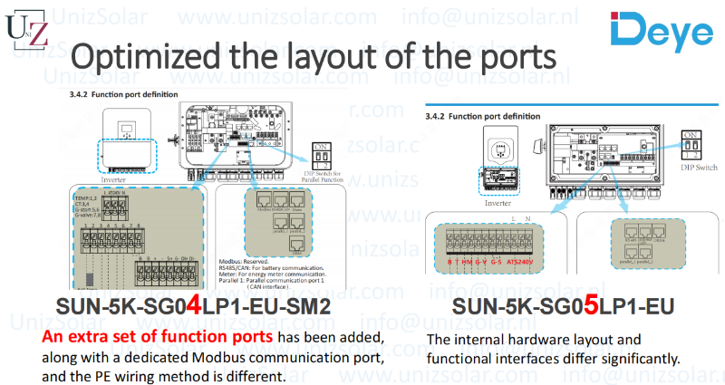 ● SUN-5K-SG04LP1-EU-SM2 : Tá sraith bhreise de phoirt feidhme ann, lena n-áirítear calafort Modbus RTU tiomnaithe, agus scéim forais PE eile.